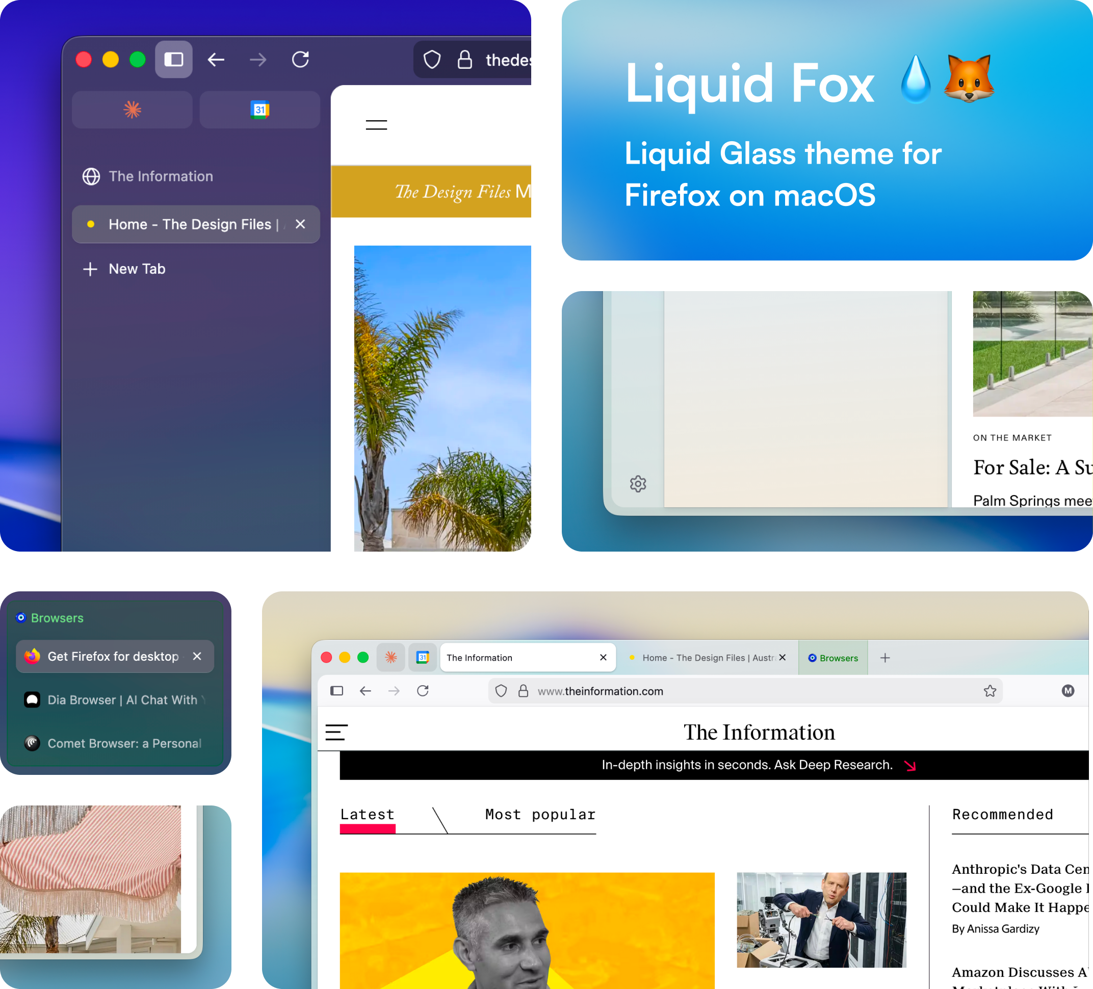 So I made Liquid Fox. It's a single CSS file that gives Firefox macOS vibrancy blur, rounded content panels, soft shadows, gradient outlines, and nicer tab groups. It works with both vertical and horizontal tabs. Light mode, dark mode. One file, no extensions.
