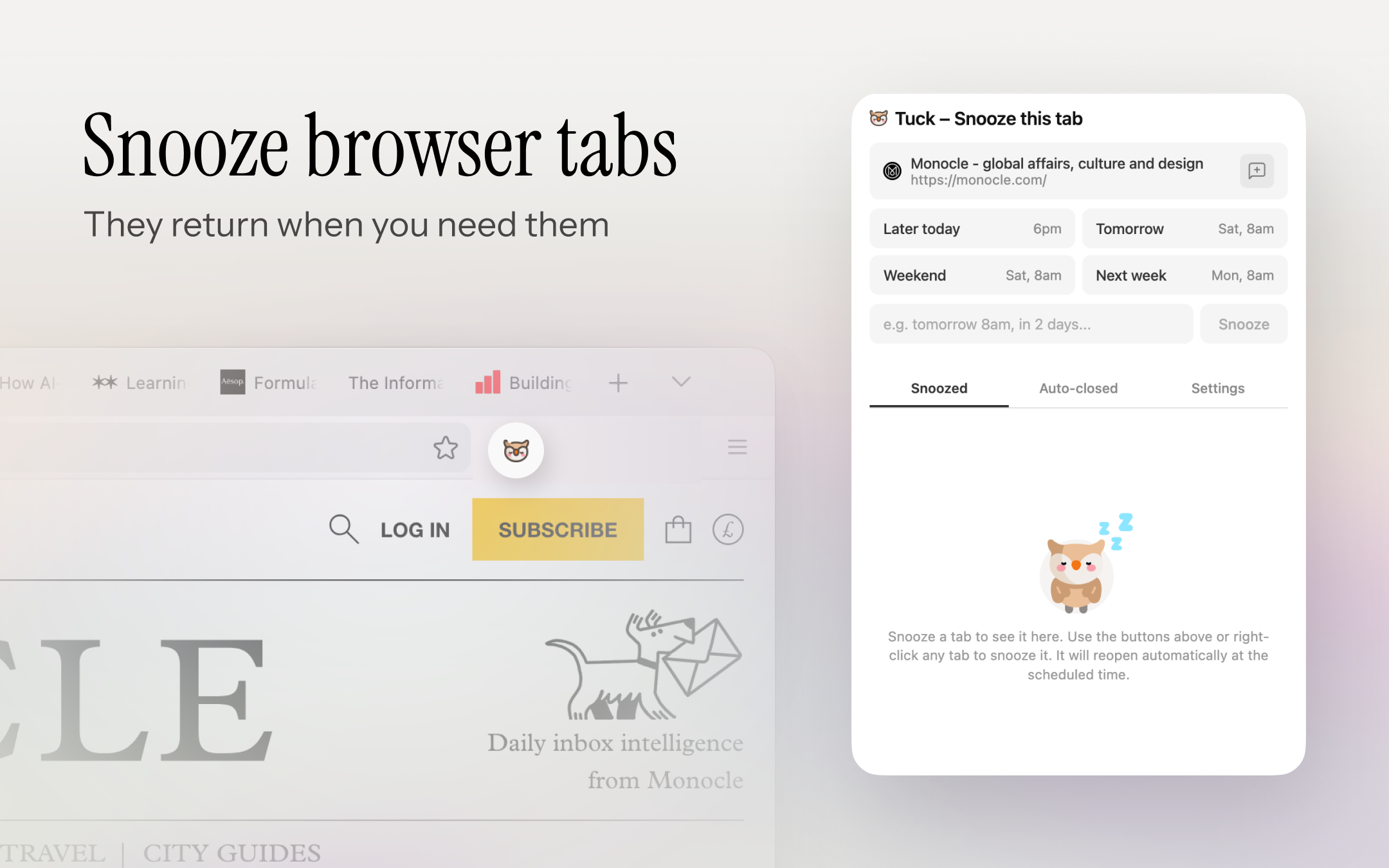 It snoozes tabs. You type "tomorrow 9am" or "next Monday" or "in 2 hours", the tab closes, and it comes back when you said. You can add a note, like "read before the meeting", so you remember why.